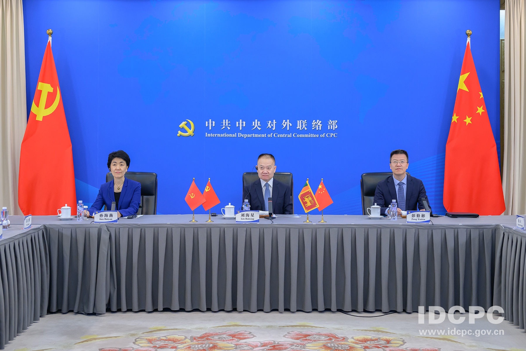中联部副部长孙海燕,中国驻斯里兰卡大使戚振宏,斯里兰卡人民解放阵线政治局委员、对外联络部部长、政府交通公路和城市发展部部长拉特纳亚克,人民解放阵线政治局委员、政府工业和企业发展部部长汉杜内提等参加视频会晤。
